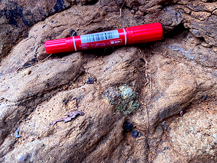 泥岩の層理面にほぼ平行に安山岩が貫入しており、丸い石英質の捕獲岩が多く見られたが、マントル捕獲岩はなし...