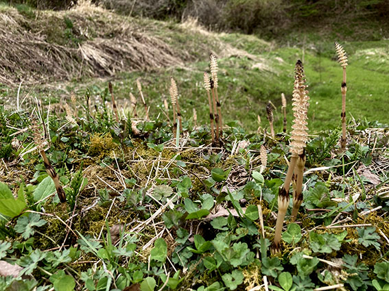 今日は湯王滝付近の緑色片岩を見に来たのだが、周り一面ゼンマイと土筆だらけでした。